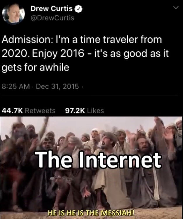 For better or for worse. The self-proclaimed time traveler told in a video published on YouTube by Paranormal Elite about whats going down in the coming years. Replace the image in the meme with a weird image that is the opposite of what is real in todays world. This meme template of a time traveler changing one small thing also known as the butterfly effect has become a new meme template on Reddit. _____Welcome to my description_____. Due to Time Travel Laws I am not allowed to disclose any information that can alter the future. Time Travel memes 2020. Its a free online image maker that lets you add custom resizable text images and much more to templates. 10223 likes 3751 talking about this.